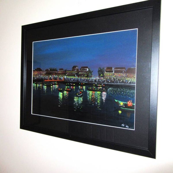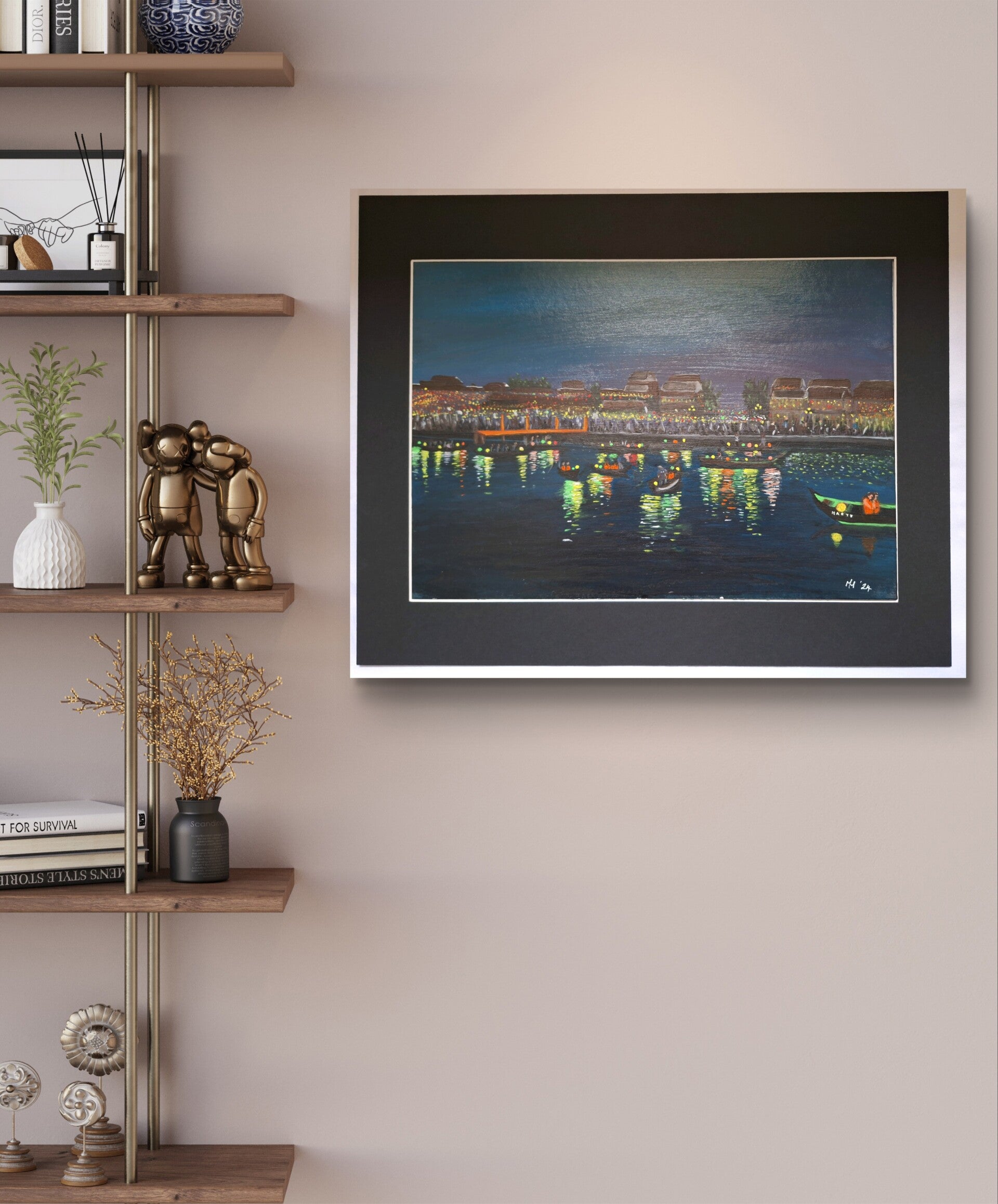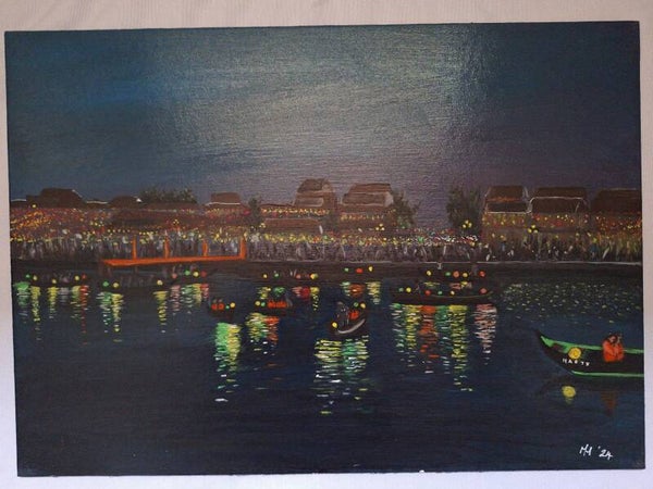This captivating painting presents a serene night scene, where gentle waters reflect the warm glow of lanterns and the soft hues of twilight. Boats drift lazily along the river, their silhouettes punctuated by the vibrant colors of the lanterns that adorn them. The background reveals a charming village, its rooftops illuminated by the shimmering lights of the festivities. This artwork conveys a sense of tranquility and celebration, inviting viewers to experience the beauty of a peaceful evening by the water. A perfect addition to any space, it brings a touch of warmth and serenity to your surroundings.