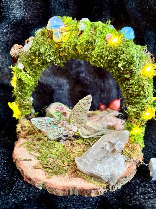 Blonde sleeping fairy under a moss arch surounded by acorns, berries and glass mushrooms. Included are fairy lights and a white crystal