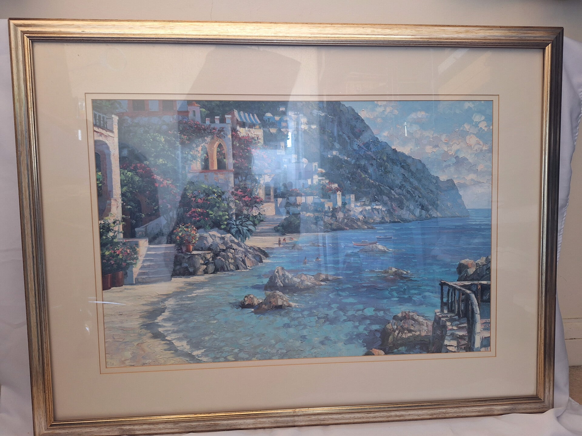 This is a beautiful idealic italian village beach scene. A print of an oil painting. Unsigned so ARTIST UNKNOWN.