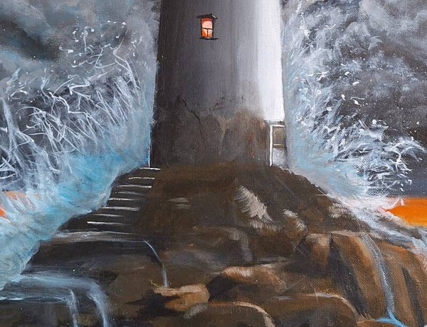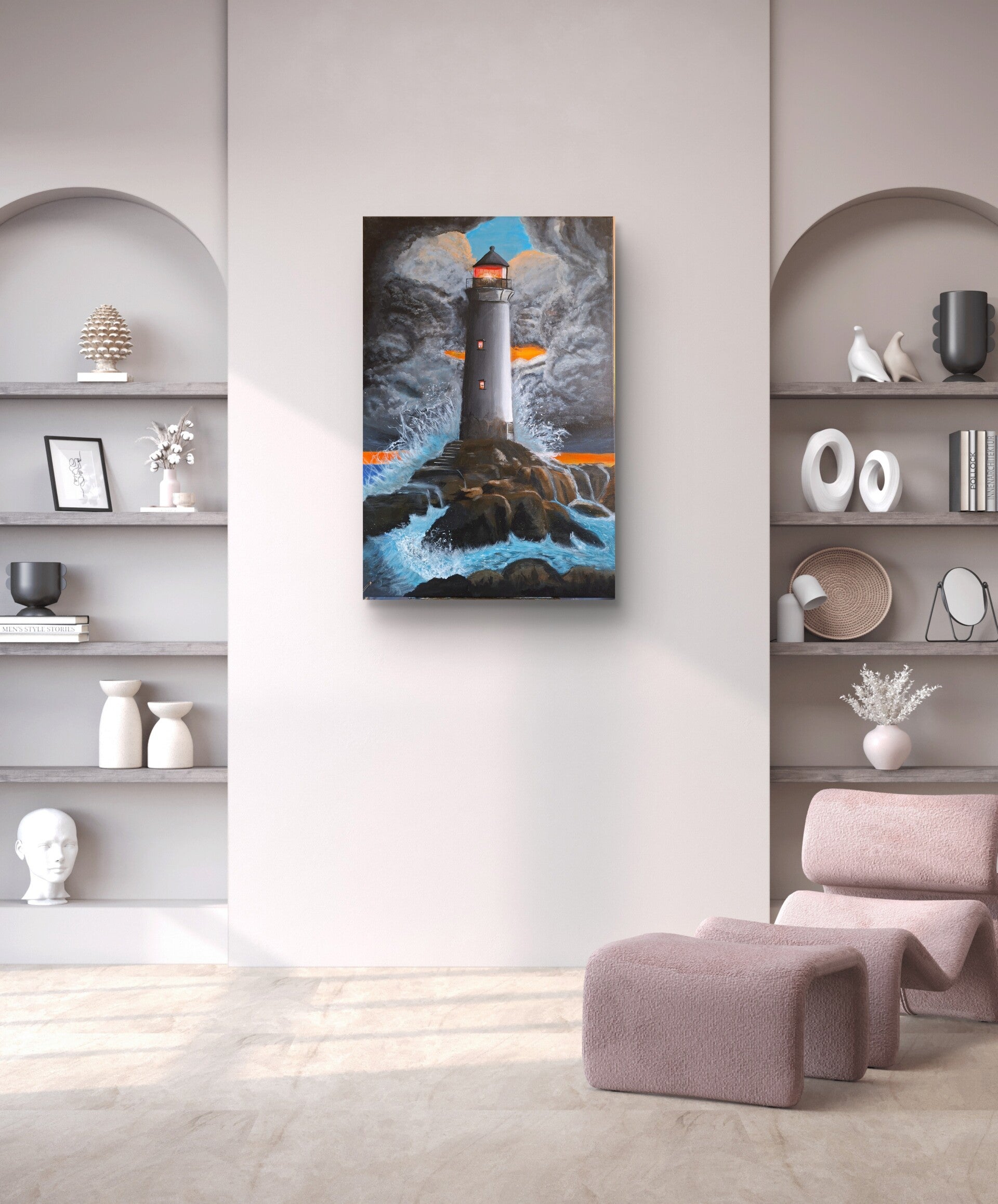 This striking seascape presents a lighthouse standing resolute against a stormy backdrop. The dramatic interplay of dark clouds and vibrant orange hues evokes a sense of urgency and strength, while the crashing waves reflect nature's raw power. The illuminated windows of the lighthouse offer a beacon of hope amidst the tumult, inviting contemplation of resilience in challenging times.