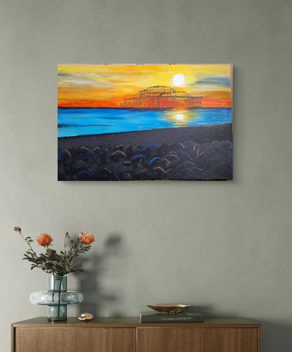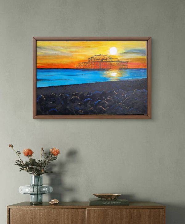 work. The vibrant sunset casts a warm glow over the tranquil waters, reflecting hues of orange and blue that dance across the pebbles. The silhouette of the old pier, stands proudly against the backdrop, embodying a sense of nostalgia and connection to the environment, reminding us of a time gone by.